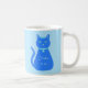 This awesome mug features a digital art image of a cute blue cat with a curly tail. His eyes are pale blue with black pupils. He is wearing a pink bow in his hair and a shining blue collar round his neck with a blue token on it.