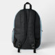 This awesome backpack features a digital art image of a cute blue cat with a curly tail. His eyes are pale blue with black pupils. He is wearing a pink bow in his hair and a shining blue collar round his neck with a blue token on it.