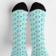 This awesome pair of patterned crew socks features a cute cartoon of a blue owl with sleepy eyes, a wide-open beak and cute fluffy feathers. The owl is holding a powder blue balloon. There is pale blue text inside the balloon that says, “Baby boy”.
