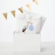 This awesome pack of favour bags features a graphic image of a cute white Stork with black tail feathers holding onto a pale blue bundle of blankets. There is blue text on the bundle that says "Baby Boy". This design is perfect for celebrating a baby shower.