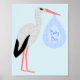 This poster features a graphic image of a cute white Stork with black tail feathers holding onto a pale blue bundle of blankets. There is blue text on the bundle that says "Baby Boy". This design is perfect for celebrating a baby boy.