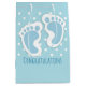 A gift bag with a charming image of blue baby boy's footprints with a heavy white outline.