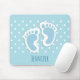 A mousepad with a charming image of blue baby boy's footprints with a heavy white outline.