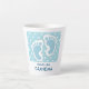 Latte mug with a charming image of blue baby boy's footprints with a heavy white outline.