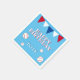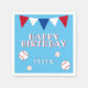 Cute Baseball Kids Birthday Party Napkins. The design has baseballs and bunting flags in red, white and blue colours on a blue background. Personalise it with your kid`s name. Great for a boy who loves baseball.