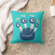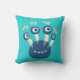 Cute monster kids pillow with a vector illustration of a smiling cartoon character with four eyes and colourful eyelashes over customisable vibrant turquoise background.