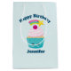 Happy Birthday gift bag. A light plue and pink polka dot background. Illustrated with a cute blue cupcake with pink frosting and a kawaii smiling face. A cherry on top also has a cute face. A shooting star is flying in the air.