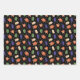 A set of wrapping paper sheets for Halloween featuring three fun patterns: one with a bunch of monsters against a black background; the same pattern against a white background; and one sheet with matching stripes in orange, white, blue, and green.