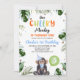 Any age our cheeky monkey birthday invitation featuring a cute monkey, blue party hat, green balloon and tropical foliage. This cheeky monkey birthday invitation also features a multicolored word.
