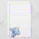 Adorable kawaii dog stationery! A blue cartoon puppy is happily chewing on a bone and wagging its tail. Cute pet lover drawing has a polka dot border with a rainbow of colours. Colourful products are perfect for adults or kids to write on! Ruled in lilac.
