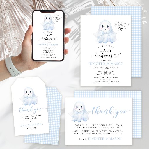 Discover our charming "Little boo is almost due" themed baby boy shower invitation featuring a delightful cute ghost wearing a bow tie in gingham pattern. This adorable design is ideal for celebrating the imminent arrival of your little one with joy and elegance, inspired by Halloween-themed baby showers.