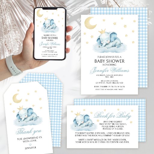 Celebrate your little one's arrival with our adorable and elegant ‘Little Peanut’ themed baby boy shower invitation! Featuring a charming watercolor baby elephant sleeping on a cloud surrounded by golden stars and moon. This timeless design is perfect for a classic, boho, or storybook-inspired baby shower. A delightful way to set the tone for a memorable and stylish celebration!