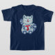 Cat lover kids shirt with a cute digital illustration depicting a happy blue cat in love. The little feline is smiling and holding a big red heart.