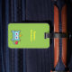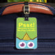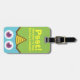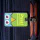 Front of luggage tag shows part of the blue monster with purple eyes and a yellow horn. The funny caption reads "Psst! Monster in bag. Bites if bag is mishandled.". A humourous way to get others to handle your bag with care. The other side however reveals that it is actually a cute little blue monster that has a yellow horn on its head, a sharp tooth protruding out of its mouth, a red tail, purple eyes and tiny arms and feet.