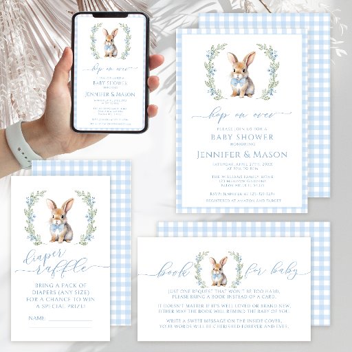 Adorable baby boy shower invitation featuring a charming blue watercolor illustration of cute bunny surrounded by spring flowers and a greenery wreath on a gingham pattern background. Ideal for baby boy showers, Easter themes, watercolor invitations, and spring floral designs.