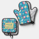 This cute oven mitt and pot holder features an adorable pattern with colourful white birds, red hearts, and sweet yellow mugs against a bright blue background. Personalise with your name. Makes the perfect gift for your wife, mum, or grandma for Mother's Day, birthday, or special occasion.