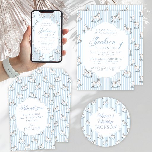 Discover our charming vintage-inspired birthday boy invitation, exuding a delightful preppy style. Featuring a sweet baby blue wooden rocking horse set against a striped pattern backdrop, this invitation radiates elegance and joy, drawing inspiration from French aesthetics. Perfect for celebrating your little one's special day, whether it's his first or second birthday.