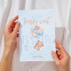 This adorable card features a cute teddy bear floating in the sky by balloons inviting you to a baby shower to celebrate the mother-to-be on a blue-sky background. Customise this card with your own party details making it easy to plan this memorable event!