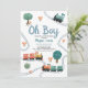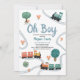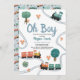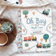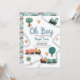 This cute and modern ‘Oh boy’ boys baby shower invitation design features a train travel design, with colourful trains, trees, and greenery, with a matching train travel pattern on the back, and can be personalised with the mother’s names and other details necessary for your party. The perfect travel-themed addition to your boys baby shower.