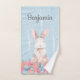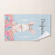 This adorable bunny hand towel is perfect for a baby nursery bath or a kids bathroom. This woodland animal hand towel features a soft blue woodland background with a bunny sitting on a bed of pretty pink and blue flowers. Personalise with the name of your choice and it's perfect for either a boy or a girl.