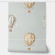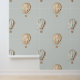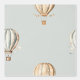 Cute boho-inspired wallpaper for your baby's nursery featuring muted blue, taupe and cream vintage hot air balloons on a light sage green background.