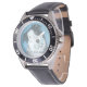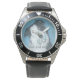 Badger is a very cute black and white border collie dog, he looks so cute because he’s offering his favourite little blue teddy bear toy to let his mum know he loves her. This collie dog protrait has a nice sky blue background that brings this wrist watch design alive The cool trendy watch has a matching wrist strap and can be worn by anyone, but especially anyone who loves the border collie breed, they really are a very special working dog breed. This collie dog portait art watch will make a wonderful gift for someone special who loves all breeds of dogs , but especially border collies with exceptionally cute expressions, or perhaps you simply want to treat yourself to this great original designer wrist watch. This is a customisable watch, you can personalise it with your own text. The original artwork for Badgers pet portrait is painted in soft pastel.