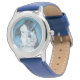 Badger is a very cute black and white border collie dog, he looks so cute because he’s offering his favourite little blue teddy bear toy to let his mum know he loves her. This collie dog protrait has a nice sky blue background that brings this wrist watch design alive The cool trendy watch has a matching wrist strap and can be worn by anyone, but especially anyone who loves the border collie breed, they really are a very special working dog breed. This collie dog portait art watch will make a wonderful gift for someone special who loves all breeds of dogs , but especially border collies with exceptionally cute expressions, or perhaps you simply want to treat yourself to this great original designer wrist watch. This is a customisable watch, you can personalise it with your own text. The original artwork for Badgers pet portrait is painted in soft pastel.
