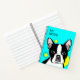 Cute Boston Terrier flat colour illustration on an aqua background with yellow circles, text is editable