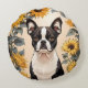 Cute Boston Terrier Yellow Sunflowers Round Cushion