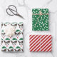 NewParkLane - Whimsical Christmas wrapping paper sheets, one with a pattern of cute Boxer dog cartoons, wearing a green Santa hat. One sheet has a fun green and white striped pattern and another one a red and white polkadots pattern.