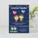 Amaze your guests with this twin birthday party invite featuring a cute boy and girl holding balloons with modern typography against a blue background. Simply add your event details on this easy-to-use template to make it a one-of-a-kind invitation. Flip the card over to reveal a colourful stripes pattern on the back of the card.