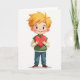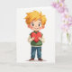This greeting card shows a young boy standing front and center on a plain white background, holding a bright red heart close to his chest. He has spiky golden hair, wide brown eyes, rosy cheeks, and a big, happy smile that feels full of kindness. He’s wearing a forest-green sleeveless sweater over a cream long-sleeved shirt, along with cuffed blue jeans for a relaxed look. The heart is the main focus, shining in a strong red color that clearly stands for love and caring. Soft lighting gives the boy and the heart a gentle glow without any harsh shadows, keeping the scene calm and sweet. ❤️❤️🍫