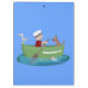 For nautical fun! This design features a boy rowing his boat on the ocean with a dog and sea gull with a happy fish saying hello! Drawn in cute cartoon illustration style.