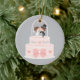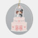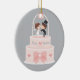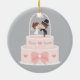 Personalised ornament that comes with an illustration of a wedding cake with ribbon and hearts. The cake toppers include a bride in white dress and groom in black top hat and suit under a wedding bells floral archway. Personalise with the names of the wedding couple and the wedding date!