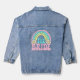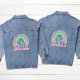 Funny and cute hippie-inspired denim jacket for the bride-to-be at her bachelorette party. The back features "The Bride" in a large pink and teal blue retro font, 70's style pop-art flower illustrations and a pink, blue, green and yellow rainbow. A coordinating "The Party" jacket is available for the bach squad.