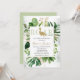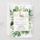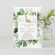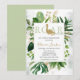 Surrounded by greenery, this elegant green and gold baby shower invitation sets an elegant, modern tone for a dinosaur baby shower.
