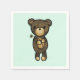 Paper napkins with a simple illustration of a cartoon brown bear holding a yellow daisy. Set on a pale green background.