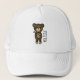 A trucker hat personalised with a name with a simple illustration of a cartoon brown bear holding a yellow daisy.