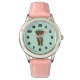 A child's watch with a simple cartoon illustration of a brown bear holding a yellow daisy.  Hello written over his head.