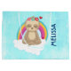 A cute cartoon illustration of a meditating sloth. Wearing a crown of wildflowers on her head, floating peacefully on a white cloud with a colourful rainbow behind. A couple of hearts nearby. Peaceful and happy. The background is a light blue grunge style image.