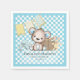 Adorable teddy bear design with elephant and bunny rabbit with a picnic basket. Cute flag banner at top left corner with a blue and white check pattern background. Templates made for you.