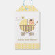 Cute, elegant and classy bumble bee themed baby shower label for your party favours and gift bags in a colour palette of yellow, white and brown. Design includes a cute little baby wearing a bumble bee feelers headband as he looks out of the yellow stroller. The stroller has a pattern of polka dots and stripes. A little bee is buzzing by leaving a heart shape trail. Background of yellow and white hexagon honeycomb pattern. Personalise easily with your party message.