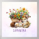 Cute watercolor illustration of two bunnies (one with a pink bow), spring flowers and a wheelbarrow. Personalise it with your name or message.