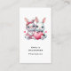 Business card with an illustration featuring 2 white furry bunnies sharing a big pink heart. The girl bunny is wearing a cute bow on her head and heart-shaped glasses. The boy bunny is wearing an adorable little suit with a tie.