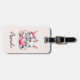 A luggage tag with an illustration featuring 2 white furry bunnies sharing a big pink heart. The girl bunny is wearing a cute bow on her head and heart-shaped glasses. The boy bunny is wearing an adorable little suit with a tie.
