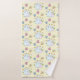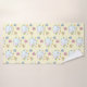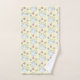 A patterned towel set with a cute mum and baby bunny standing together. Yellow daisies in the background. Whimsical butterflies fluttering about. Pale yellow background.