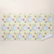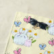 A beach towel with a cute mum and baby bunny standing together. Yellow daisies in the background. Whimsical butterflies fluttering about.