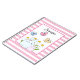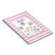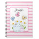 A personalised spiral notebook. Set on a pink and white striped background. A white frame with a pink border layered over top with your personalised name inside. Inside the frame an illustration a mum and baby bunny standing together. Yellow daisies in the background. Whimsical butterflies fluttering about.