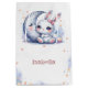 Super cute gift bag featuring cute white little bunny wearing a beautiful pink bow and a crescent silver moon with some gold falling stars.