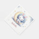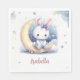 Super cute napkin featuring a cute white little bunny wearing a beautiful pink bow sitting on a lovely moon with some gold falling stars.